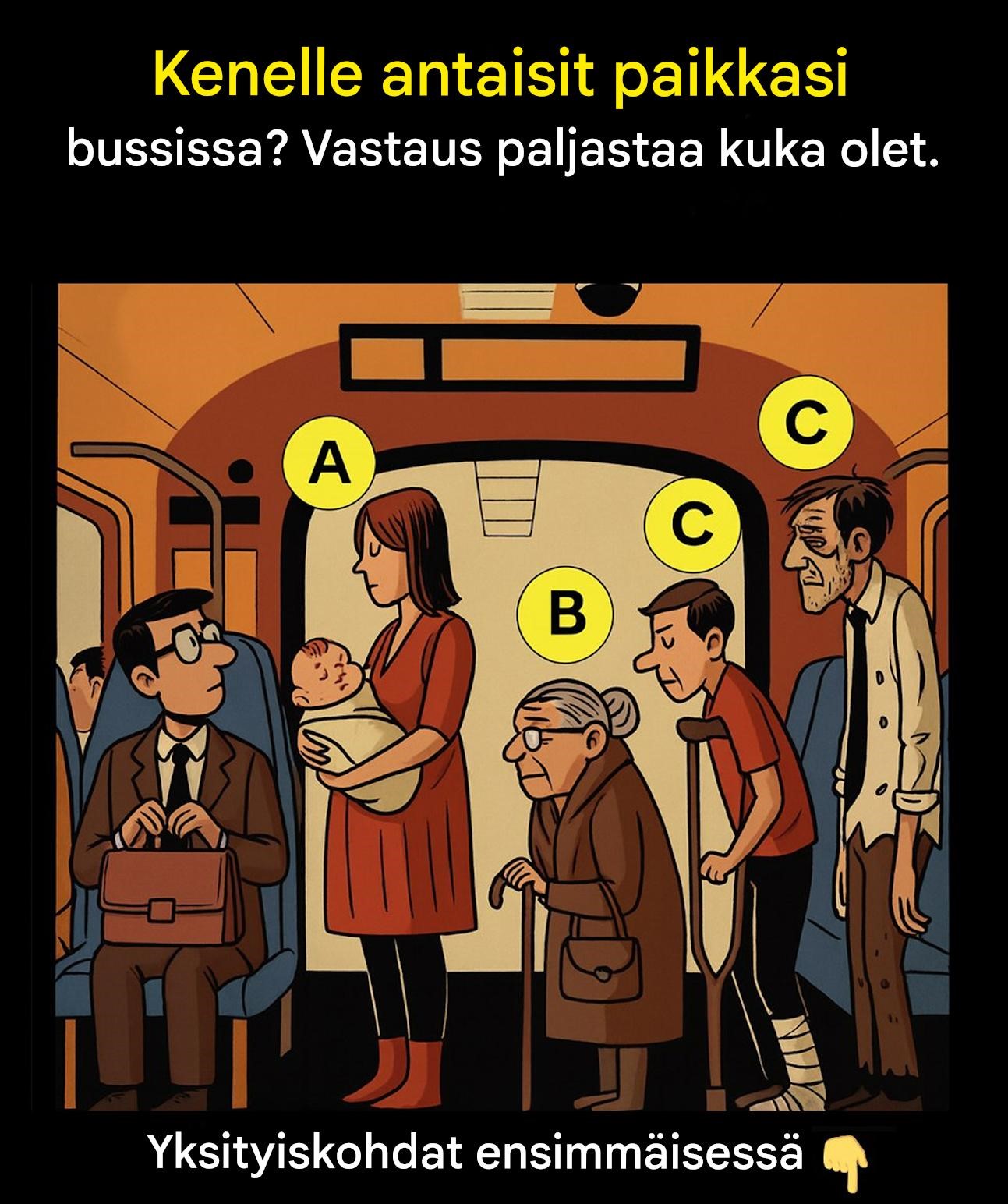 Kuvittele tämä tilanne: istut mukavasti täpötäydessä bussissa, kun kyytiin nousee useita selvästi hädässä olevia ihmisiä. Voit tarjota paikkasi vain yhdelle henkilölle. Keneen anteliaisuutesi kääntyy spontaanisti?