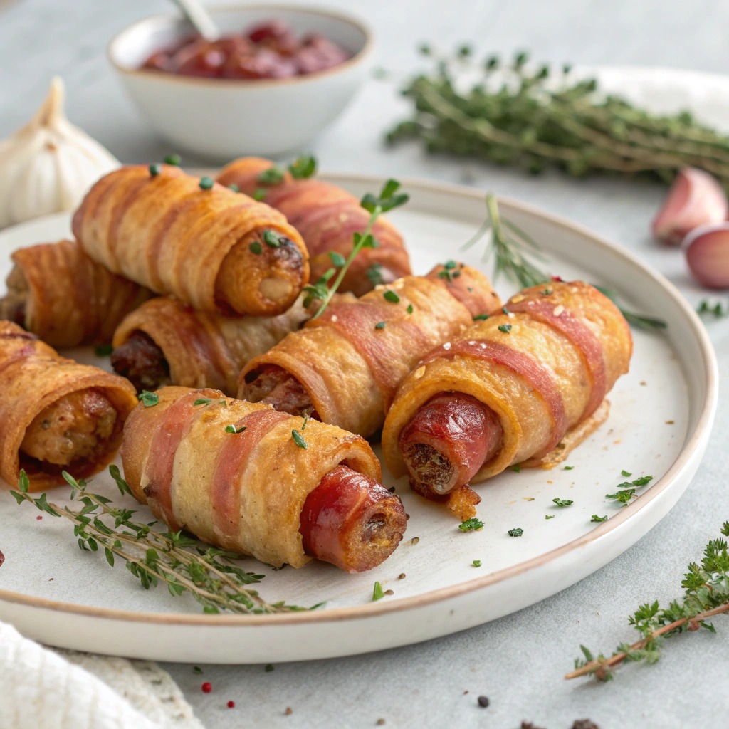 Ilmapaisto: Paista 193°C:ssa 8–10 minuuttia, käännä puolivälissä. Pancettan tulisi olla kullanruskeaa ja rapean näköistä ja makkaroiden kypsennettyä läpikotaisin.