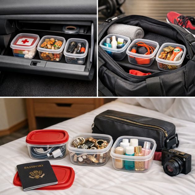 Käytä Rubbermaid-säilytysastioita autosi, kuntosalilaukkusi tai matkavarusteidesi järjestämiseen. Autossa käytä pieniä säilytysastioita ensiaputarvikkeiden, välipalojen tai pienten työkalujen säilyttämiseen. Yhden litran säilytysastia sopii täydellisesti useimpiin hansikaslokeroihin tai istuinten alle pitäen välttämättömät tavarat käden ulottuvilla.