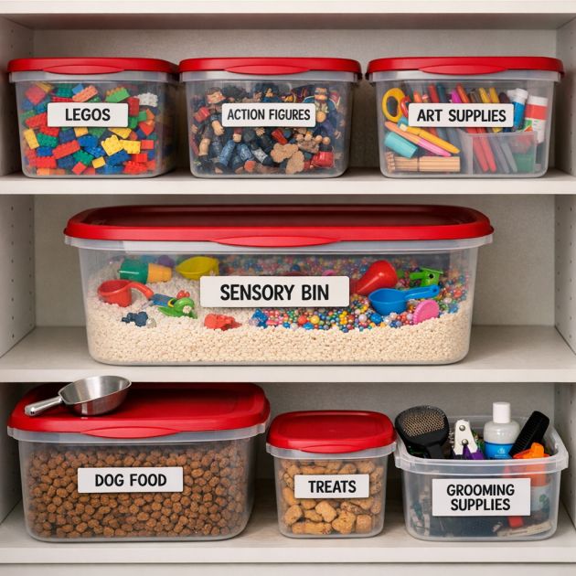 Rubbermaid-astiat ovat loistavia lasten lelujen järjestämiseen ja aistiroskien luomiseen. Käytä erikokoisia astioita lajitellaksesi lelut tyypin mukaan, kuten palikoita, toimintahahmoja tai taidetarvikkeita. Merkitse jokainen astia kannustaaksesi lapsia laittamaan tavarat takaisin oikeille paikoilleen.