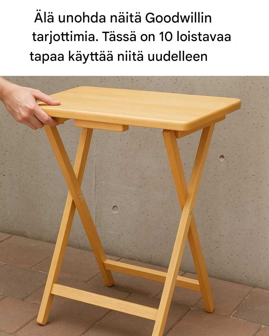 Goodwillin tarjotin voidaan helposti muuttaa toimivaksi sohvapöytätarjottimeksi. Hio karkeat reunat, levitä uusi maalikerros tai petsi ja lisää kahvat helppoa kantamista varten. Tätä tarjotinta voi käyttää lehtien, kaukosäätimien tai koriste-esineiden järjestämiseen sohvapöydällä, mikä lisää sekä tyyliä että toiminnallisuutta asuintilaasi.