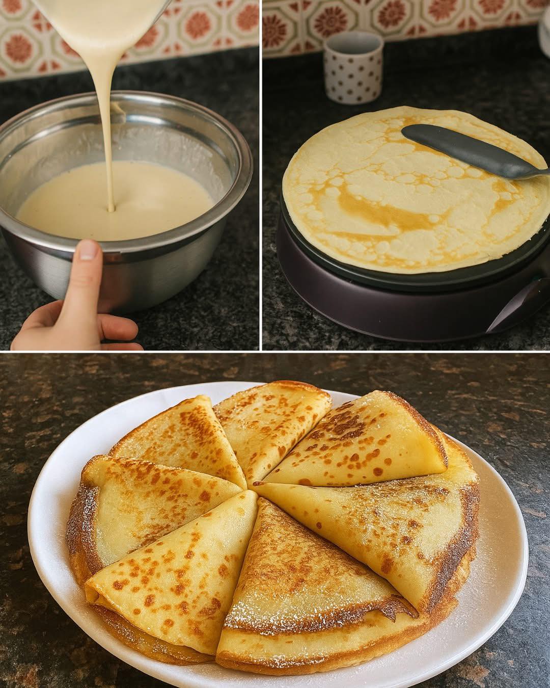 Kaada pieni kauhallinen taikinaa kuuman pannun keskelle ja kallista sitä heti pyörivin liikkein, jotta taikina leviää tasaisesti ohueksi kerrokseksi. Crepen tulisi peittää koko pannun pohja muutamassa sekunnissa.