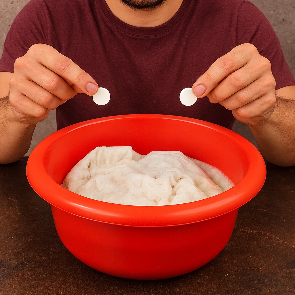 Salaisuus on käyttää poreilevia puhdistustabletteja – samoja, joita käytetään hammaskiven poistamiseen, hammasproteesien puhdistukseen tai herkkien pintojen desinfiointiin.