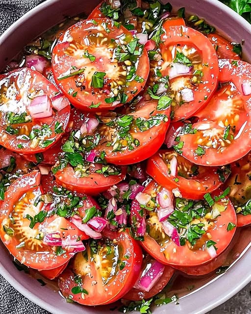 Värikäs ja tuoksuva salaatti, jossa kypsiä tomaatteja marinoidaan yrttivinegretissä.