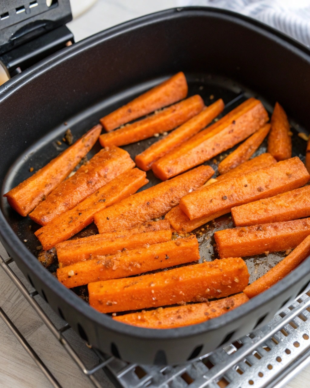Porkkanoiden kiertoilmafriteeraus on mullistava menetelmä aloitteleville kokeille! Tämä menetelmä tuo esiin porkkanoiden luonnollisen makeuden ja luo samalla murean sisuksen ja hieman karamellisoituneen ulkopinnan. Lisäksi se on paljon nopeampi kuin perinteinen uunissa paistaminen ja vaatii vain vähän puhdistusta.