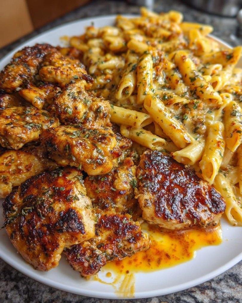 Kanaa voikastikkeessa cheddarilla, parmesaanilla ja valkosipulilla, tarjoillaan kermaisen pennepastan kera