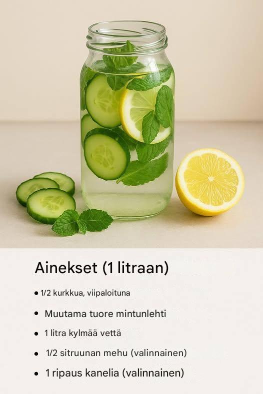 Nauti tästä **kotitekoisesta kurkku-minttuvedestä sitruunalla**, jossa tuoreen mintun raikkaus kohtaa kurkun miedon maun ja sitruunaisen kirpeän vivahteen luoden kevyen mutta tehokkaan juoman, joka käynnistää aineenvaihduntasi ja poistaa myrkkyjä kehostasi. Tämä sokeriton, mutta maukas ja vahva juoma on täydellinen aamupiristys, aterian välissä virkistävä juoma tai osa terveellistä hyvinvointisuunnitelmaa.