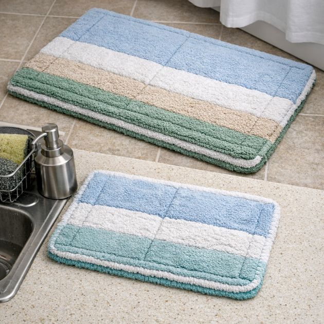 Nämä itse tehdyt kylpyhuoneen matot sopivat täydellisesti veden imemiseen ja tarjoavat pehmeän paikan astua ulos suihkusta. Jos haluat tehdä pesualtaan viereen tippa-alustan, leikkaa siitä pienempi pala, esimerkiksi 30 x 45 cm, keräämään astioista tai käsistä tippuvan veden.