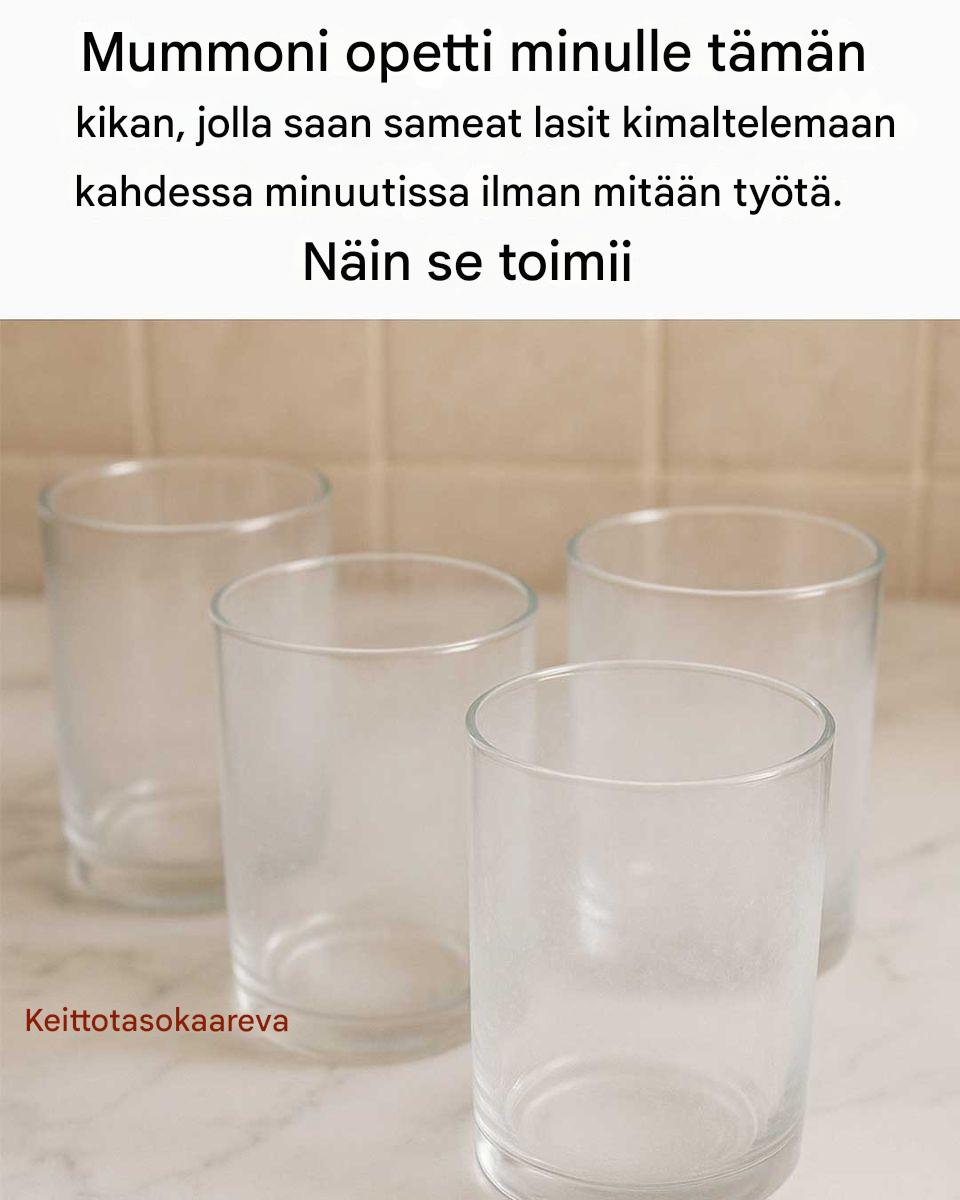 Kasvaessani ihailin aina isoäitini upouusia lasiesineitä, jotka näyttivät kimaltelevan vaivattomasti auringonvalossa. Hänellä oli viehättävä kyky pitää lasinsa moitteettomissa kunnossa, taito, jonka oletin olevan loputtoman hankaamisen ja kiillotuksen tulosta. Eräänä päivänä hän kuitenkin paljasti minulle pienen salaisuutensa – nopean ja helpon kikan, joka muuttaa sameat lasit säihkyviksi helmiksi vain kahdessa minuutissa. Ja parasta? Se ei vaadi mitään työtä.