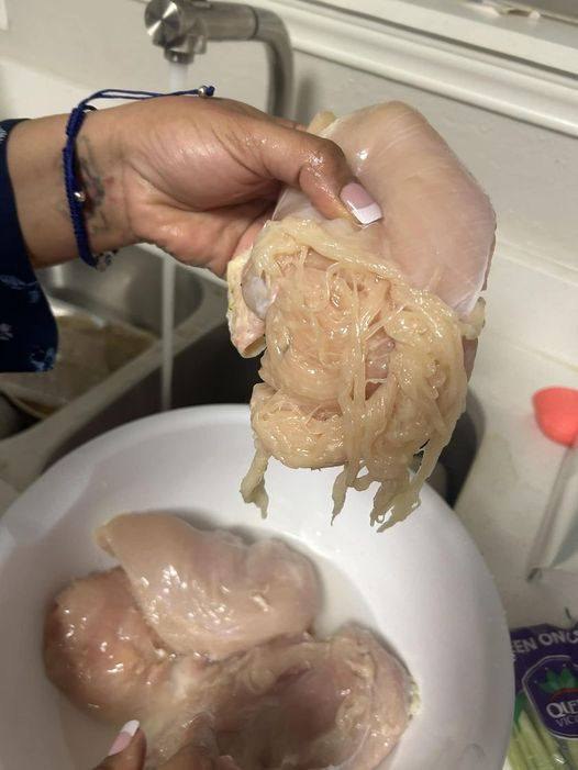 Irvingissä, Texasissa, asuva äiti Alesia Cooper jakoi kuvan pelottavasta kananrinnasta 21. maaliskuuta. “Olen miettinyt tämän julkaisemista, mutta koska minun oli pakko nähdä se, niin tehkää tekin”, äiti sanoi jakaessaan kuvan kananrinnasta, joka alkoi repeytyä säikeiksi. “Laitoin lapsilleni illallista pari viikkoa sitten ja puhdistin lihaa normaalisti, ja kun palasin ruoanlaittoon, siitä tuli tällaista (SIC).” Cooper sanoi.
