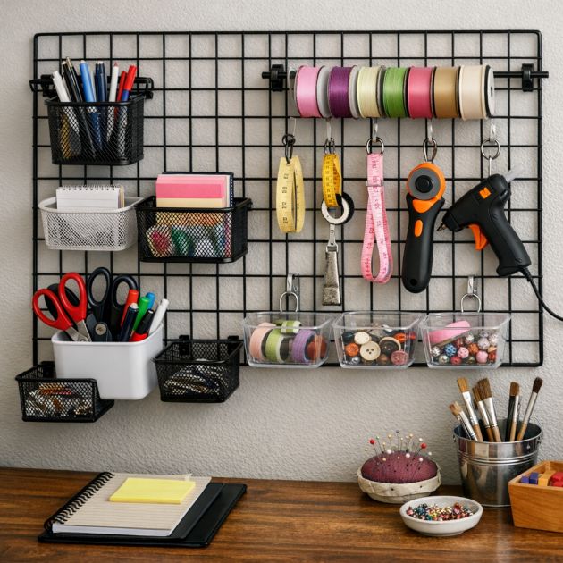 Käsityöharrastajat voivat ripustaa työkaluja, kuten saksia, nauhoja ja mittanauhoja, lankoihin. Näin kaikki tärkeät työkalut ovat käden ulottuvilla ja maksimoivat tuottavuutesi ja luovuutesi.