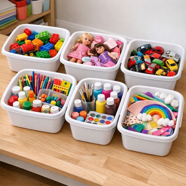 Tiskialtaat ovat erinomaisia ​​lasten lelujen ja askartelutarvikkeiden järjestämiseen. Käytä niitä erottelemaan erityyppisiä leluja, kuten palikoita, nukkeja tai autoja. Tämä tekee siivoamisesta helppoa ja auttaa lapsia oppimaan järjestystä.