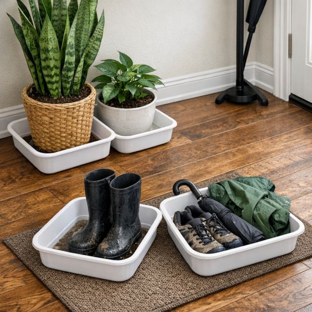 Tiskialtaita voidaan käyttää myös tippa-alustoina esimerkiksi vuotaville kengille, sateenvarjoille tai märkille takeille. Aseta ne eteisen viereen pitämään vettä ja mutaa, mikä helpottaa siivoamista ja pitää kotisi siistinä.