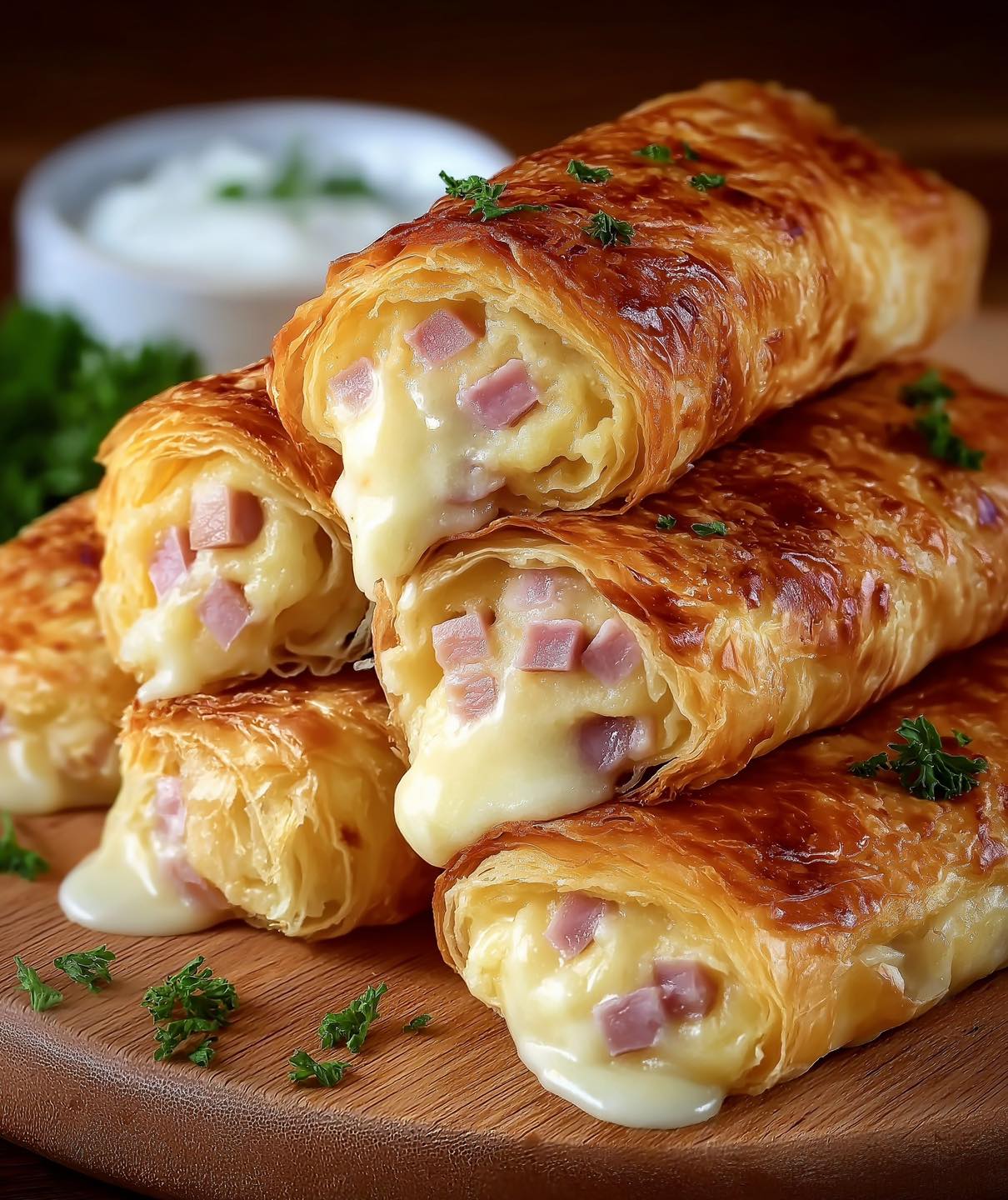 Rapeaksi paistetut kinkku- ja perunasikarit Taloudellinen ja herkullinen resepti. Rapeaksi paistetun filotaikinaleivonnaisen ja kermaisen juustoisen perunamuusin välinen kontrasti on vastustamaton.