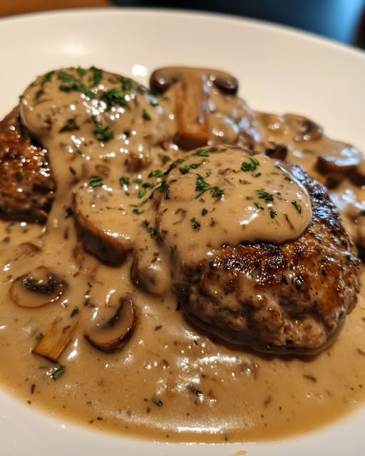 Hitaasti kypsennetty yrteillä maustettu Salisbury-pihvi sienikastikkeella