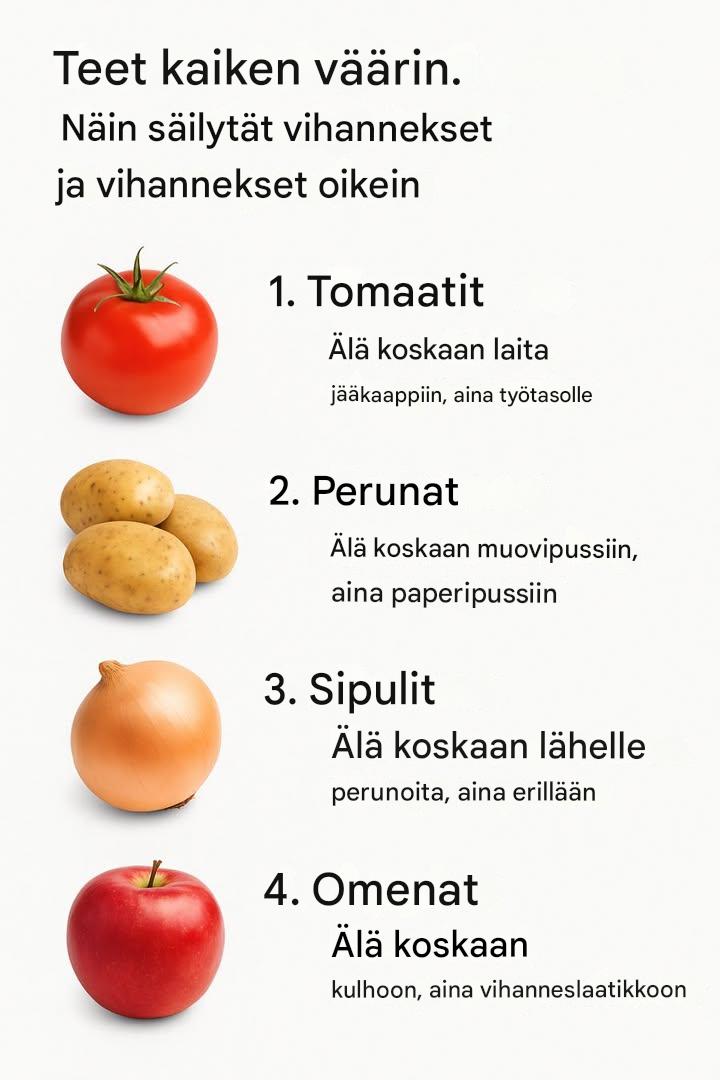 Tomaatit ovat yksi yleisimmin väärinymmärretyistä säilytystuotteista. Monet ihmiset laittavat ne vaistomaisesti jääkaappiin ajatellen, että se pidentää niiden tuoreutta. Jäähdytys voi kuitenkin aiheuttaa tomaattien maun menettämistä ja jauhoisen rakenteen kehittymistä. Säilytä tomaatit sen sijaan työtasolla, mieluiten yhdessä kerroksessa mustelmien välttämiseksi.