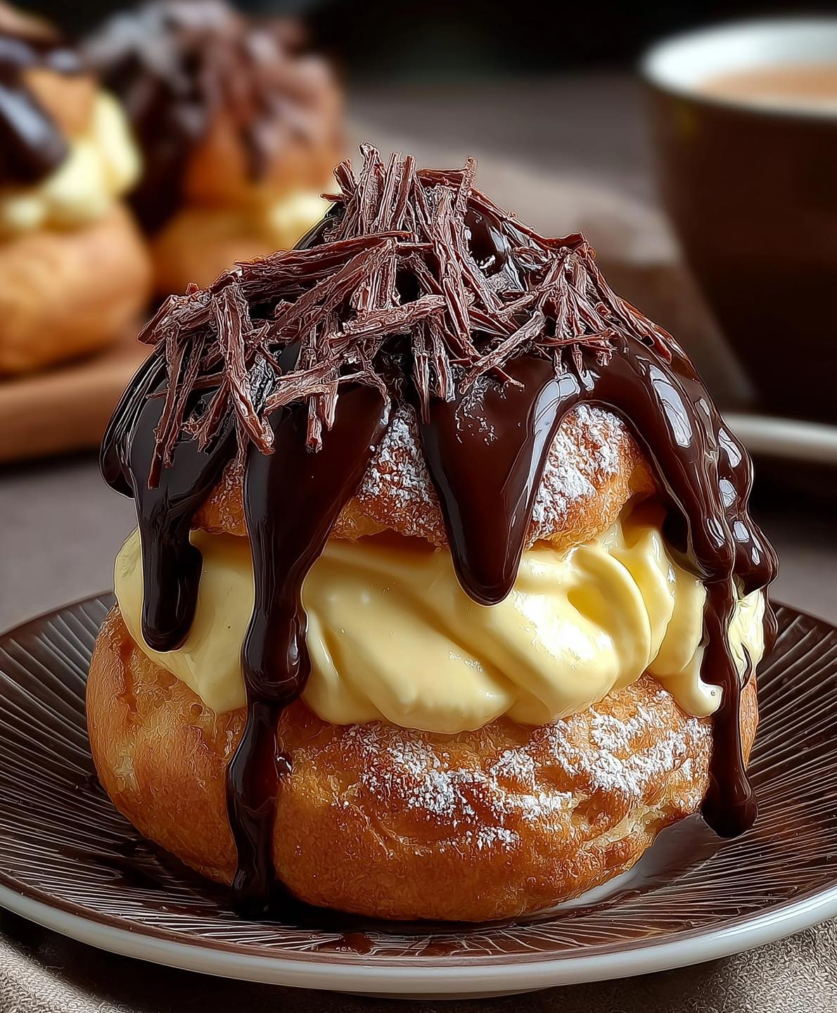 Tuulihatut, jotka on täytetty crème anglaise -voikermalla ja kuorrutettu suklaalla