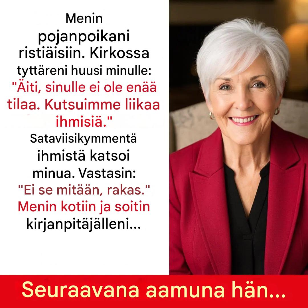 Joskus sydämen särkevät vain muutamat silminnäkijöiden kuullen kuiskatut sanat pahimmalla mahdollisella hetkellä. Sinä päivänä 68-vuotias Claire oli valmistautunut pikkutarkasti pojanpoikansa kasteeseen. Hän oli järjestänyt kaiken, rahoittanut kaiken ja suunnitellut jokaisen yksityiskohdan. Silti kirkon sisäänkäynnillä hänen oma tyttärensä huusi hänelle: “Sinä et kuulu tänne, äiti.” Lause, joka muutti kaiken. Lause, joka paradoksaalisesti asetti hänen elämänsä uudelle uralle.