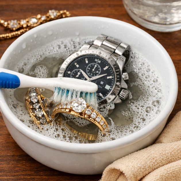 Korut ja kellot keräävät usein likaa monimutkaisiin kuvioihinsa tai pieniin rakoihin. Vanha hammasharja sopii erinomaisesti näiden herkkien esineiden puhdistamiseen. Käytä lämmintä vettä, johon on sekoitettu muutama tippa mietoa astianpesuainetta. Kasta hammasharja liuokseen ja hankaa korua tai kelloa varovasti kiinnittäen huomiota yksityiskohtiin. Harjakset auttavat poistamaan likaa naarmuttamatta jalometalleja tai kiviä. Huuhtele huolellisesti puhtaalla vedellä ja kuivaa pehmeällä liinalla kiillon palauttamiseksi.