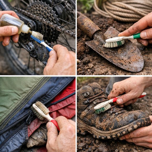Ulkoilmaihmisille vanha hammasharja on korvaamaton varusteiden kunnossapidossa. Käytä sitä polkupyörän ketjujen puhdistamiseen levittämällä rasvanpoistoainetta ja hankaamalla pois kertyneen lian. Samoin voit käyttää hammasharjaa puutarhatyökalujen puhdistamiseen lian ja ruosteen poistamiseksi. Retkeilyvarusteista, kuten teltan vetoketjuista tai vaelluskengistä, hammasharja voi auttaa poistamaan mutaa ja roskia varmistaen, että varusteesi pysyvät hyvässä kunnossa ja valmiina seuraavaa seikkailuasi varten.