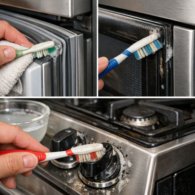 Keittiökoneissa on usein pieniä koloja ja koloja, joihin ruokajäämät ja rasva voivat kerääntyä. Vanha hammasharja sopii täydellisesti näiden alueiden puhdistamiseen. Käytä lämpimän veden ja etikan liuosta tai mietoa keittiön puhdistusainetta. Hankaa jääkaapin tiivisteet, mikroaaltouunin luukun reunat ja lieden nuppien ja kahvojen ympäristö. Harjakset ulottuvat ahtaisiin paikkoihin naarmuttamatta pintoja, jolloin kodinkoneet näyttävät ja tuoksuvat puhtailta.