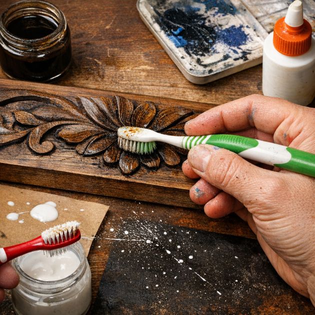 Käsityöläiset ja taiteilijat voivat käyttää vanhoja hammasharjojaan uudelleen yksityiskohtaharjoina maalaus- ja petsausprojekteissa. Jäykät harjakset sopivat täydellisesti tekstuurin lisäämiseen tai maalin hallitusti roiskuttamiseen. Käytä niitä liiman tai lakan levittämiseen pienille, tarkoille alueille. Puun petsien kanssa työskennellessä hammasharja voi auttaa viimeistelemään kaiverrettuja yksityiskohtia tai monimutkaisia kuvioita varmistaen tasaisen ja perusteellisen levityksen.